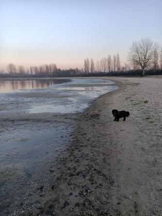 Na een rondje buurtje en de volgende dag een op en neertje strekdam, werd ik overmoedig en nam ik Boef mee voor een rondje vooroever. Zo'n rondje is om de plas en is pakweg een kilometer of vier. Het ritueel met de sleephond herhaalde zich, maar nu op pakweg twee kilometer. Dat was het kantelpunt.