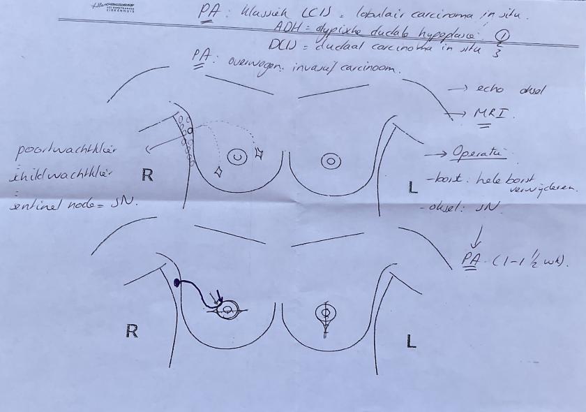 Gezien de combinatie van ADH (waarbij DCIS 1 niet uit te sluiten valt), LCIS en het invasieve carcinoom dat wordt overwogen, in een vrij groot gebied (3,5 bij 8cm), komt zij tot de conclusie dat de enige optie is dat de borst in zijn geheel verwijderd wordt.