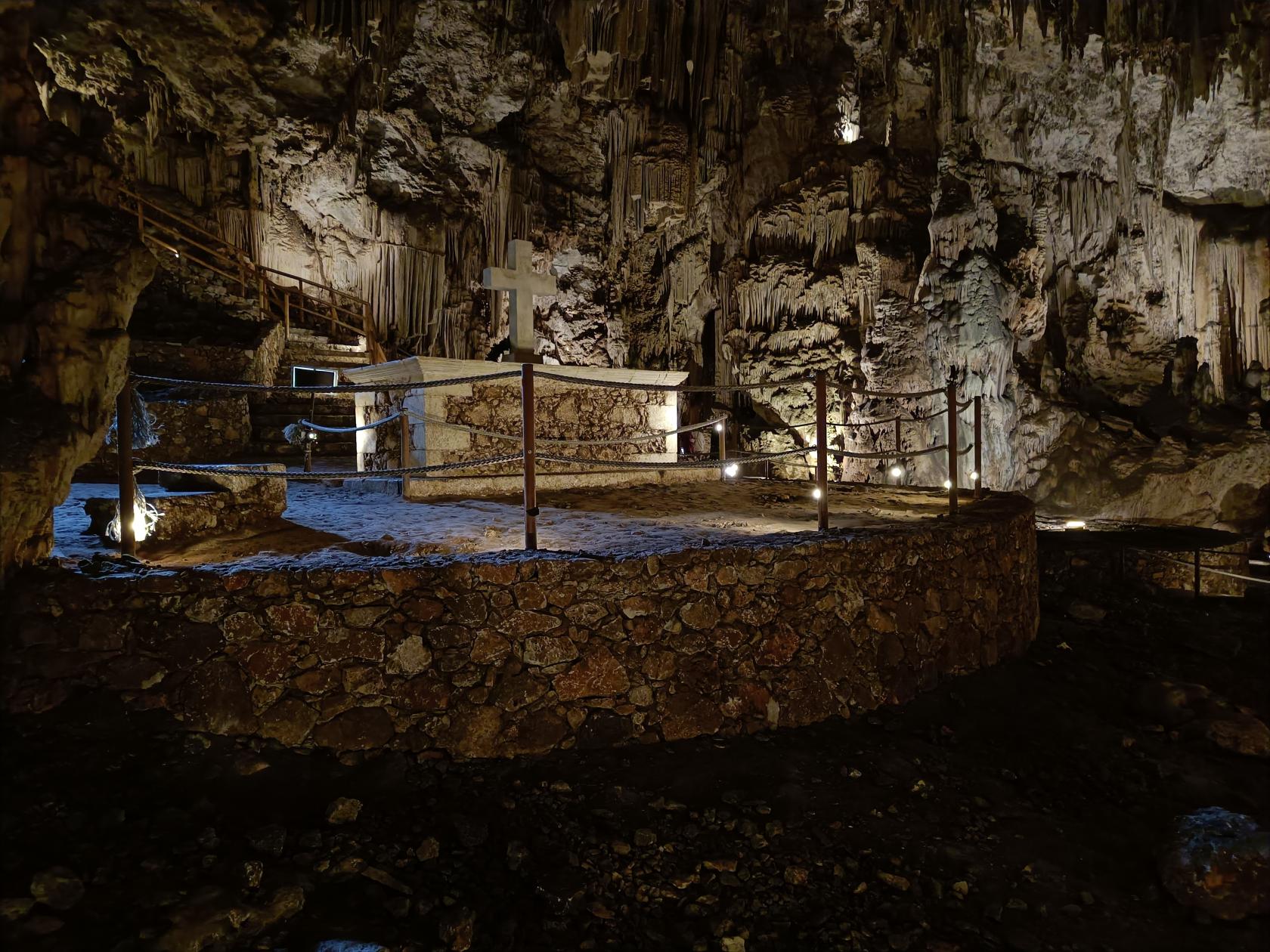 De grot is prachtig maar wel heel spaarzaam verlicht, om niet te zeggen, donker, en er is ook een soort Tombe voor diegenen die er vermoord zijn, door de toenmalige bezetters. En ook daar, weer in mijn eentje, het nummer afgespeeld, het is magisch de versluierde klanken door de druipsteen formaties te horen gaan.