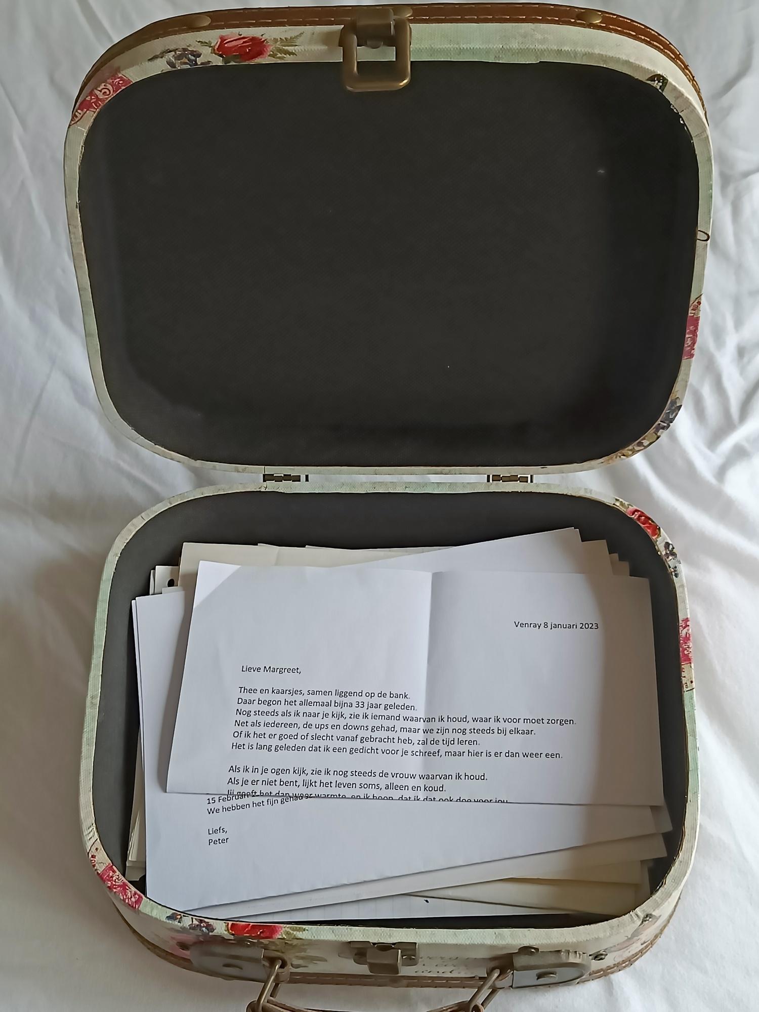 Tussen al de boeken, op onze slaapkamer stond dit koffertje, en Margreet heeft daarin alle briefjes, die ik geschreven heb, die ze de moeite van het bewaren waard vond, bewaard.