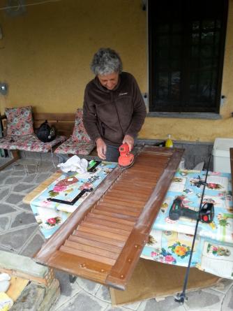 Goed, wij zijn nu in Italië, waar de zon nu volop schijnt. Het wordt dus een heel mooie dag. Ik begin weer op te knappen en doe wat klusjes rondom het huis (zie foto) Ben begonnen met het onderhoud van de luiken; grote klus er zijn namelijk 28 luiken, die aan beiden kanten geschuurd en gelakt moeten worden = dus 56 keer. En dan heb ik nog niet verteld dat ieder luik 32 schuine latjes bezit die ook geschuurd moeten worden............per luik dus 64 keer...................YEAH. Het schoonmaken en schuren valt tegen, maar gisteren heb ik al twee luiken aan een kant kunnen schilderen en dan heb je wel eer van je werk!!! Gelukkig hoeven ze niet allemaal klaar te zijn in een week!!