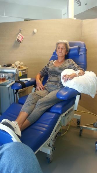 Was heerlijk rustig op de afdeling, dus de twee uurtjes in de stoel doorbrengen was niet erg. Het infuus zat prima in mijn linkerarm, de rechter ader bleek wat ontstoken door de chemostroom van vorige week, je aders lijden behoorlijk door die gifstoffen. Gelukkig hielp een ijspacking goed. Af en toe erop en masseren en dan schijnt het over te gaan.