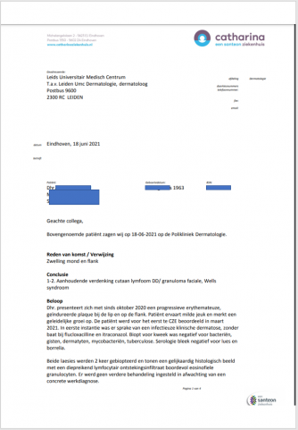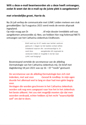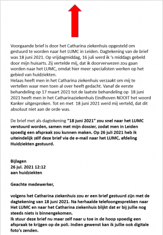 in het kort verteld: Eerst in het Catharina ziekenhuis in Eindhoven behandeld tot de tijd dat zij het niet meer wisten en mij hebben doorverwezen naar het LUMC in Leiden. Inmiddels hadden zij 3 maal twee biopten genomen en op kweek gezet. Tot 3 keer toe hebben ze mij gezegd: géén Kanker. Eind juni 2021 werd mij verteld, dat ze het in Eindhoven niet meer wisten en dat ze mij wilden verwijzen naar een ander ziekenhuis met meer gespecialiseerde artsen (LUMC in Leiden) dus.
