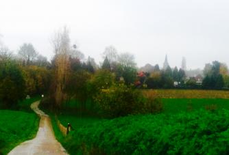 Ik draaide me weer om. Rechts van ons nog steeds het bos. Er stonden ineens twee torentjes. Overblijfselen van een poort waarvan de houten of ijzeren panelen allang waren weggevaagd, erosie door de tijd. Maar de tijd had het concept niet geërodeerd, de poort was nog steeds in functie. Vanaf de weg leidde een paadje erheen. De poort lonkte. We sloegen het smalle paadje naar rechts in, een paadje dat zichzelf uitwijdde tot de brede toegang tussen de torentjes. Meteen daarachter duikelde een holle weg de heuvel af. De weg leek een buis met gefilterd licht dat door de boomkruinen in vlekken op de bodem viel. De holle weg mondde uit in een plas zonlicht waar de bomen weken. Aan mijn moeder de taak om zonder botbreuken, met haar vier voetjes uiterst voorzichtig naar beneden te stappen. Als een paard over een rotsige bergpas.