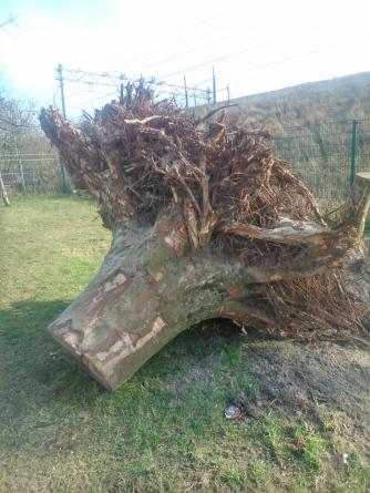 Na de kinderboerderij liep ik weer verder. Ik time mijn wandelingen. Ik houd me strikt aan een uur, méér mag, minder mag niet. Na ruim een half uur draaide ik om. Ik stuitte op uitgegraven boomstronken, op de smalle strook langs het fietspad. Opgesteld als een show van naast elkaar geplaatste, op hun kant gelegde knotsen. De show liep door onder het viaduct waar ook het fietspad onderdoor duikt. Veel wortels, goed zicht dus op wat zich voorheen majestueus als takkenstelsels onder de grond bevond en zich daar uitbreidde, in samenhang met een bot afgezaagde stam, geen takken meer. Kaal en vol samen. Prachtig, die omgekeerde wereld. Klein ding nummer drie.