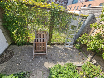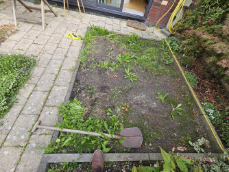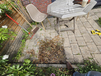 Dan eerst nog even 250 betontegeltjes naar beneden en circa 1 m3 grond in emmers van 10 liter naar de afvalcontainer voor de deur (via de trap).