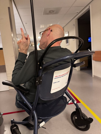 Ik zeg meneer ik doe het zo ik loop met ut mee links, u pakt mijn arm vast en ik denk uwe en niet andersom anders drukt u mijn infuus naar binnen.