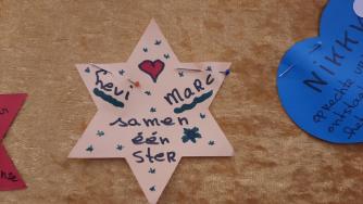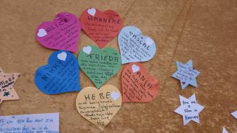 Dat is de hartenwand of ook gedenkwand die door mensen die dat willen wordt volgehangen met hartjes, sterretjes, foto's, lieve berichtjes. Herdenken degenen die we zo node missen...