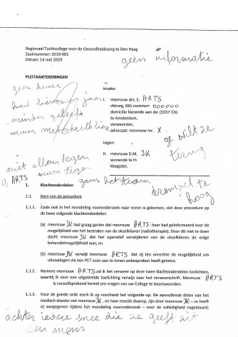 Een inleiding (1), herhaling van de klacht (2), verwijzing naar de wettelijke informatieplicht c.q. verwijzing naar andere hulpverleners (3), Als voorbeeld noem ik Med. Centrum Twente – wat al in 2017 op de webpagina radiotherapie noemt i.p.v. verwijderen (4) (n.b. Ziekenhuis Z. heeft hun webpagina pas na aug. 2022 aangepast.), Verder geef ik aandacht aan de Amaros-study en aan een artikel van het AvL uit 2014 en ik attendeer nog eens op de negativiteit van de arts op de Amaros-study waarvan zij zegt dat hierop “veel commentaar” is geweest. (5), Ik herhaal de “twee lijnen” uit het verweerschrift van de arts en dat bij het bestaan hiervan dit met de patiënt besproken dient te worden. Wat dus in Z. niet is gebeurd. (6), Er was voldoende informatie om de gewijzigde Richtlijnen al toe te passen en met de patiënten te bespreken. Het wel of niet implementeren van de Richtlijnen is geen reden voor excuus om dit niet te doen. (7 en 8), Zelfs al in haar verweerschrift verwijst zij naar de Richtlijnen van 2012 waarin R.T. al als goed alternatief wordt besproken!! En ik verwijs naar een bericht uit 2010.(9), En als laatste vernoem ik waar het predicaat van Pink Ribbon voor staat. (10).