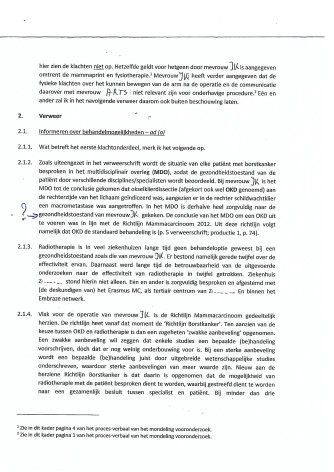 2.De kern van mijn verwijt aan dr. E. is dat zij mij niet geïnformeerd heeft over een tweede behandeloptie, te weten “bestralen van de okselklieren” en dat zij mij niet heeft doorverwezen naar een andere behandelaar. Nadat bij mij de diagnose borstkanker was gesteld, is de informatie die ik heb ontvangen beperkt gebleven tot informatie betreffende een borstsparende operatie (MST) en de schildwachtklierprocedure (SWK). Indien de uitslag van SWK positief zou zijn, dan zou een volgende operatie t.w. okselklierdissectie (OKD) nodig zijn. Deze vond plaats naar aanleiding van de positieve SWK.
