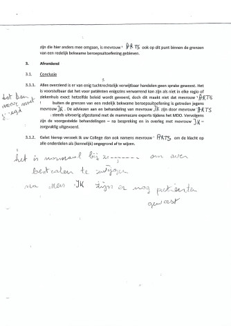 Punt 3. Afrondend dat er niet verwijtbaar is gehandeld. Weer terugvoerend op het MDO, dat advies en behandeling is afgestemd met de mammacare experts. Dat de voorgestelde behandelingen zorgvuldig zijn uitgevoerd. (Dat laatste is waar. Chirurgisch heeft ze goed gewerkt, maar het mes had in de kast moeten blijven liggen. Als zorgverlener heeft ze gefaald met voorbedachten rade.)