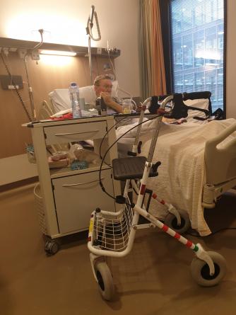 Vandaag ligt Raymond precies 3 weken in het ziekenhuis. Eindelijk gaat het met kleine stapjes de goede kant op! De pijn in de lies is momenteel (met een morfinepleister, morfinepillen, paracetamol en Lyrica) dragelijk. Hij kan nu uit bed en loopt elke dag met de fysio een stukje met de rollator! Voor de hartritmestoornissen zijn ze met andere tabletten begonnen. Mocht na verloop van tijd blijken dat deze niet voldoende werken, dan moet hij waarschijnlijk een Maze Ablatie (Google 😙) ondergaan. De bloedwaarden worden er helaas niet beter op. Zijn Hb komt niet meer boven de 4.6. Om de paar dagen krijgt hij een bloedtransfusie.