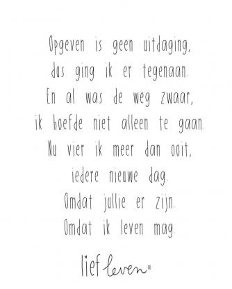 Lieve vriendin, wat goed en fijn en flink dat je het kunt, de moed er in houdt, er weer voor gaat. Ik appte het ook al: ik zou er wat voor over hebben je een knuffel te kunnen geven. Tranen van ontroering vanwege de reacties van jouw Roelof en je dochters.