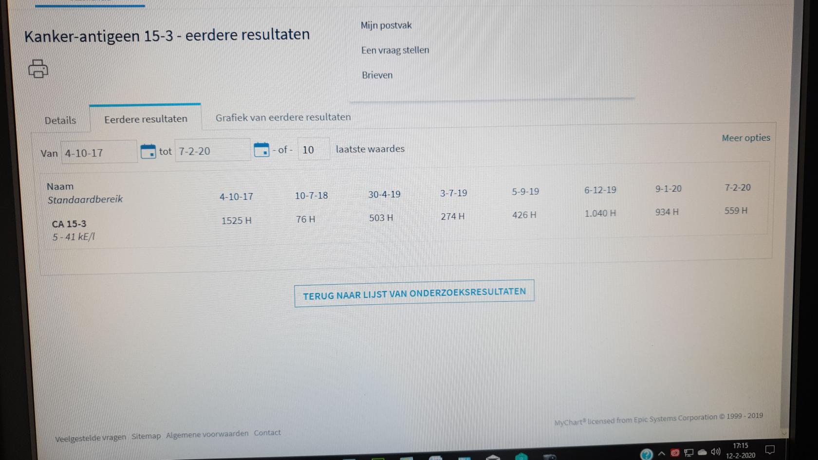Woensdagavond toch nog even mijn dossier bekeken. Zie dat mijn oncoloog ook mijn tumormarkers heeft vrijgegeven. Mijn hart slaat over en weer durf ik eigenlijk niet te kijken😱 Toch wint mijn nieuwsgierigheid het. Ik kijk en kijk nog eens ik spring begin te huilen. Ik moet het delen met familie en lotgenoten. Toch voelt het niet oké. Maar mijn blijdschap wint het de tumormarkers zijn na 2e kuur met 400 bijna afgenomen. Joepie dus het spul werkt. Dikke tranen van blijdschap maar ook de angst. Want ondanks mijn blijdschap zegt het kankerspookje je lever kan die het wel aan? Zou mijn oncoloog mij vertellen dat ondanks de goede resultaten van de tumormarkers het verstandiger is te stoppen met de taxol? Gelukkig niet, vanmorgen was ik op gesprek bij hem en hij was even blij als wij. Hij stelde voor om door deze uitslag het bewijst dat het goed zijn werk doet de scan even een maand te verzetten. Bewijs dat het aanslaat heb ik al. Dus eind maart ipv eind februari. De verzamelnaam bloedwaarden was niet verontrustend. De uitslagen van vanmorgen waren al een stuk beter. Dat mijn lever het zwaar heeft is zeker waar maar hersteld zich al.