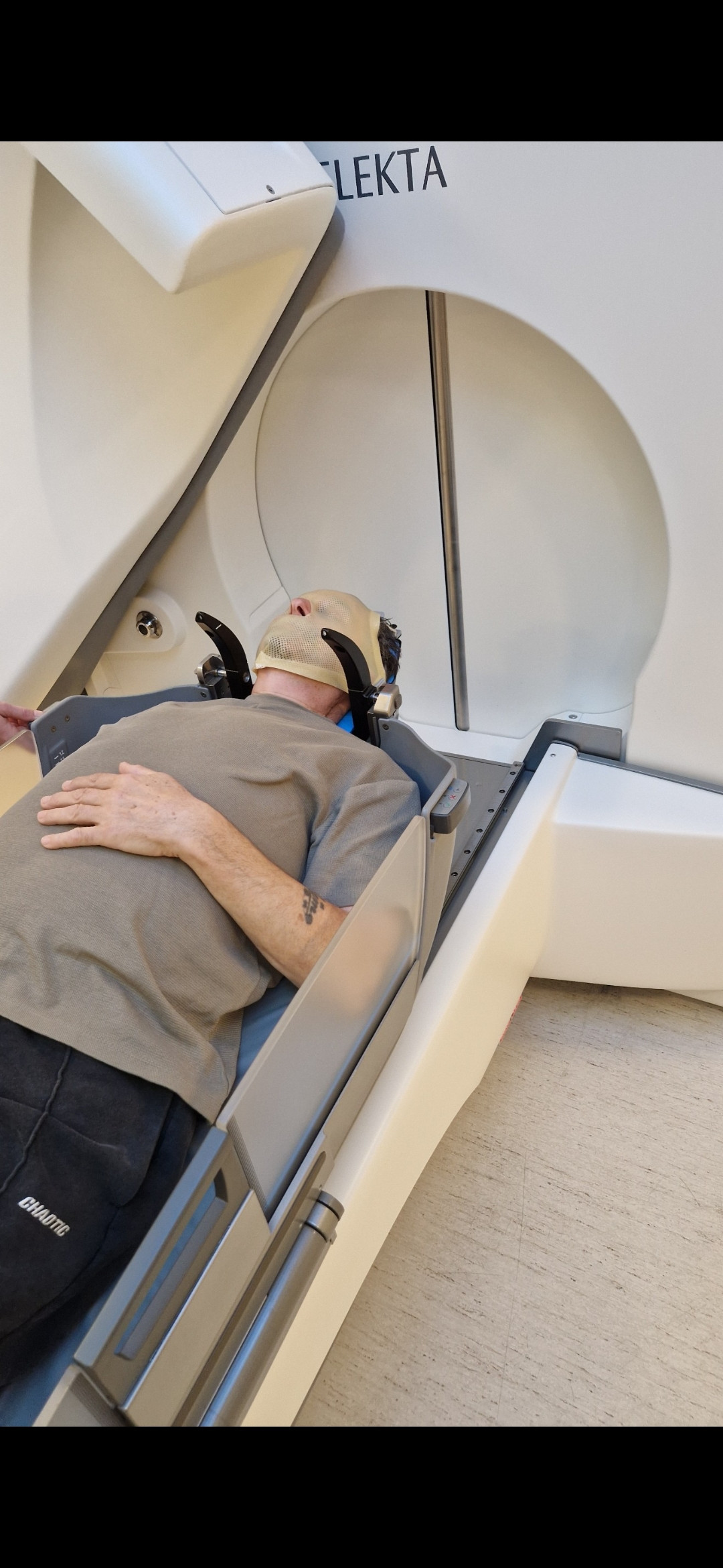 Goedemorgen, afgelopen maandag is Sam gestopt met de Mektovi en Braftovi ivm hoge koorts en rillingen. Omdat hij afgelopen vrijdag voor de Gamma Knife naar het AVL moest, was dat niet handig natuurlijk. We moesten al vroeg aanwezig zijn en melden bij radiologie. We werden naar een kamertje gebracht om te wachten. Als snel werd er geprobeerd een infuus te prikken, maar helaas lukte dit niet. Sam werd gehaald voor de MRI en daar werd een infuus geprikt. MRI, altijd weer spannend, maar was nodig om een behandelplan te maken voor de bestraling. Daarna direct bloedprikken om zijn waardes weer te bekijken. Na ruim een half uur kwam de arts om het plan te bespreken. Er zouden 2 hersenmetastase bestraald worden. De arts vertelde dat er 1 niet meer te zien was en de andere stabiel is. Dat was goed nieuws! We werden meegenomen om een kunststof masker aan te meten. Mooi gezicht hoor, wat een techniek. Na weer een halfuur wachten gingen we naar de Gamma Knife. Sam werd vastgeklikt aan het bed om zo stil mogelijk te liggen. Toen moest ik weg. Het zou ongeveer een halfuur duren. Inderdaad, na 35 minuten kwam hij terug, klaar. Zo byzonder ook. Met 3 dexamethason gingen we naar de oncoloog om te bespreken wat we gaan doen met de pillen. De bloedwaardes zijn nog steeds niet goed, maar er wordt wederom niet verder gekeken waar dit toch vandaan komt. Het kan dit zijn, het kan dat zijn. De arts stelt voor om over te stappen naar andere combinatie brafmek. Hopelijk reageert hij daar beter op want stoppen kan nog niet omdat het nog niet stabiel is. Tot nu toe gaat het goed, geen koorts, geen rillingen. Met de andere pillen had Sam na weer starten, al de zelfde dag koorts. Duimen dus maar. Met masker en al, konden we om 13.45 weer richting huis.