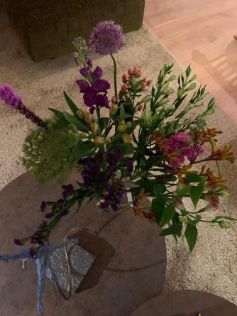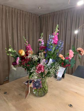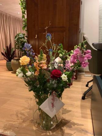 Tussen de middag ga ik lunchen met mijn directe collega’s en Theo in een restaurantje. Een gezellig laatste samenzijn, waar ik nog mooie cadeaus krijg en ik ook wat kleine afscheidscadeautjes uitdeel. Al met al is het een hele mooie, gezellige dag met veel vrolijkheid en een enkele traan en aan het einde van de dag loop ik met armen vol bloemen en cadeaus naar buiten, waar Theo de auto heeft geparkeerd om alles mee naar huis te nemen.