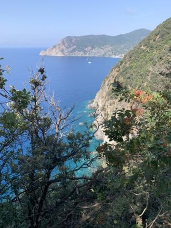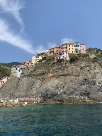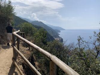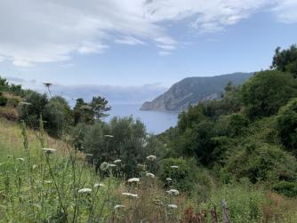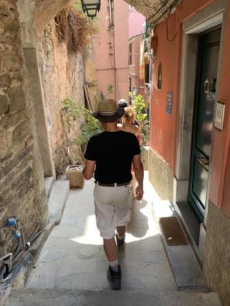 We hebben een heerlijke week gehad met de kinderen en kleinkinderen in een huis op het Toscaanse platteland, zonder internet maar met mooie uitstapjes en veel waterplezier in ons eigen zwembad. Voor Theo wel vaak teveel prikkels, zoveel mensen de hele week om hem heen, zodat hij regelmatig overdag ging bijslapen. Ook de warmte, vele muggenbultjes en de concentratie die hij nodig had tijdens het rijden op de slechte wegen met super korte in- en uitvoegstroken en snelheidsduivels, zorgden dat zijn emmertje snel vol was. Gisteren hebben we afscheid genomen van ons gezin en zijn neergestreken in Monterosso, het laatste van de 5 dorpjes van Cinqe Terre aan de Middellandse zee. De lange autorit terug naar huis hebben we in stukjes geknipt, zodat Theo voldoende energie heeft om het grootste gedeelte achter het stuur te zitten, wat hij graag doet. Vandaag rustdag, hebben we afgesproken. Daar past een wandelingetje wel bij, dus hebben we gekozen voor het ‘blauwe pad’, een bekende route hier die je van oost naar west of omgekeerd kan lopen. We willen het stukje tussen Monterosso en het volgende dorpje Vernazza lopen, 3,5 km lang in 1 uur en 45 minuten. Hiervoor moeten we een dagkaart kopen bij de plaatselijke Italiaanse VVV en de dame daar adviseert ons in Monterosso te starten. Het is een steil begin, maar dan loop je een stuk in de schaduw en later wordt het wat vlakker. We volgen haar advies en voorzien van hoed, zonnecrème, 3 liter water en 2 bananen gaan we op pad. Ik heb nog niet eerder zoveel uit de rotsen gehakte traptreden gezien die slingerend omhoog gaan. Wat is dit zwaar! Zelfs in de schaduw is het ruim 30 graden en het pad blijft maar stijgen. Al snel moet Theo rusten om zijn hijgende ademhaling onder controle te krijgen, terwijl mijn hartslag net zo snel omhoog schiet als de traptreden. Met rode wangen rusten we telkens even uit, en gezeten op de trap passeren ons veel hijgende, zwetende medewandelaars die een stukje verder moeten bijtanken. Wij zijn zo’n beetje de oudsten, dus blijkbaar doen we het nog niet zo slecht, dat geeft ons weer wat moed. Terwijl waterstraaltjes via onze rug de berg aflopen en wij dankbaar uit de waterflessen drinken, kunnen we op de vlakkere stukken weer op adem komen. Theo heeft sinds de chemo meer moeite gekregen met zijn evenwicht, dus we doen het rustig aan bij stukken die lastig te lopen zijn of geen reling hebben. Soms voetje voor voetje daalt Theo de rotsen af, de man die in het vorige leven als een klimgeit zijn weg kon vinden. Na ruim 2 uur kunnen we de kuitenbijter achter ons laten en komen we aan bij het dorpje Vernazza. We duiken meteen een winkeltje in om focaccia te kopen. Het zout dat via onze nieren en poriën is ontsnapt moet weer worden aangevuld. Met doorweekte kleding van het vocht dat we hebben verloren, stappen we op de boot, een watertaxi die tussen de dorpjes vaart. Een koude douche, siësta en lunch, dan kunnen we er weer tegen. Met de watertaxi maken we nog een paar korte tochtjes om andere dorpen te bezoeken. We sluiten na 15 km wandelen de dag af met een pizza en Italiaans ijsje. Morgen een lange rit voor de boeg, via Zwitserland naar de Elzas, dus op tijd gaan slapen. Lekker dagje was het vandaag.
