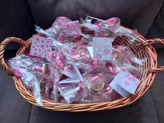 Oktober is borstkankermaand, en omdat ik borstkanker heb, had ik voor alle medewerkers op de dagopname een "bloemetje" meegenomen. Deze had ik de week daarvoor op mijn vakantie gemaakt. Een leuke bezigheid. Ik had de bloemetjes gemaakt van knopen op ijzerdraad. Als "vaasje" had ik een klein houten klosje waar ik wat roze katoen omheen gedraaid had. Voor de stabiliteit een klein houten schijfje onder het klosje geplakt en daaromheen een doorzichtig folietje gedaan. Een kaartje eraan, en voila, het bedankje was klaar. Lang leve Pinterest voor het idee van de knopenbloemen, en de Action voor de klosjes en houten schijfjes. De bedankjes werden echt gewaardeerd, dus dat was wel heel leuk om te horen.