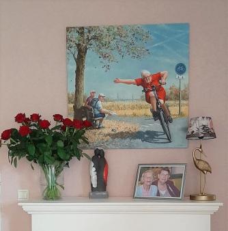 We hebben een nieuw schilderij gekocht. Althans, een reproductie op canvas. Ik word zo vrolijk van die vrouw. Met haar rode jurk aan, haar kniekousjes, haar flubber armen, grijs haar, bril op, de lipjes strak. Op de fiets, altijd hard rijdend, ik ga DIE kant op. Zoek t uit allemaal, maar IK ga die kant op. Wil je mee? Prima, leuk. Niet? Dan niet. De mannen kijken haar vol bewondering na. Dit ben ik, denk ik. Frank zegt, dat ben jij; en ik zit op die bank, vol bewondering naar je te kijken. Een prachtige herinnering aan een moeilijke tijd die we samen doormaken, zo noemt hij het schilderij. Dat eigenlijk te duur was voor onze portemonnee. Maar deze hoort bij ons, zegt hij. Ik schoot vol in de winkel. En nu hangt ie. Boven de schouw. Alsof het nooit anders is geweest.