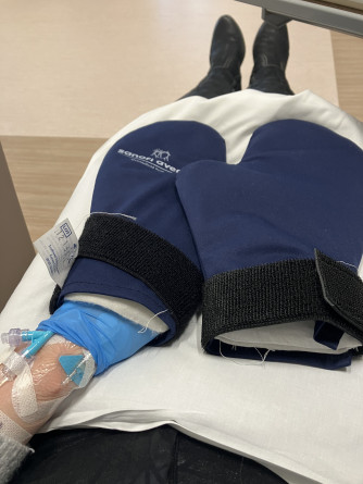 Gisteren de 2e keer Paclitaxel gekregen, dat ging prima, ik heb de ijshandschoenen toch maar weer geprobeerd maar dan mijn handen er iets minder diep in gestopt en dat ging heel goed! Ik voel me nog steeds prima, maar de huiduitslag is vandaag wel veel heftiger geworden; over mijn borst, rug, hals en gezicht! Ik heb maar wat antihistamine genomen in de hoop dat het een overgevoeligheidsreactie is en snel weer wegtrekt… ik word er niet knapper op zo!!
