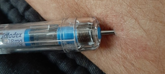 In week 17 krijg ik weer een injectie in mijn buikvet, de prikdienst van het ziekenhuis neemt de Zoladex mee, hoef ik zelf niet te regelen en de prikdienst van het ziekenhuis heeft ervaring met het zetten van een Zoladex injectie en ze werken wat hygiënischer. In uniform, handschoentjes aan, plek wordt ontsmet, etc. etc.