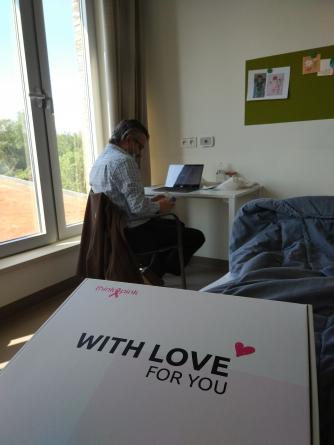 In de voormiddag komt Jurgen langs. Hij is oncocoach en geeft me een doos van Think Pink af. Goed om de gedachten te verzetten. Er zitten enkele folders en producten in, een hartvormig kussen en een boek rond borstkanker. Een mooi en tof initiatief! Jurgen kan niet bij me blijven wachten, maar heeft aan de verpleging gevraagd hem op te bellen wanneer ik 'naar beneden' mag. Hij zal me begeleiden naar het OK, wat ik op zich apprecieer, want dit is mijn eerste volledige narcose en dat is toch altijd wat spannend.