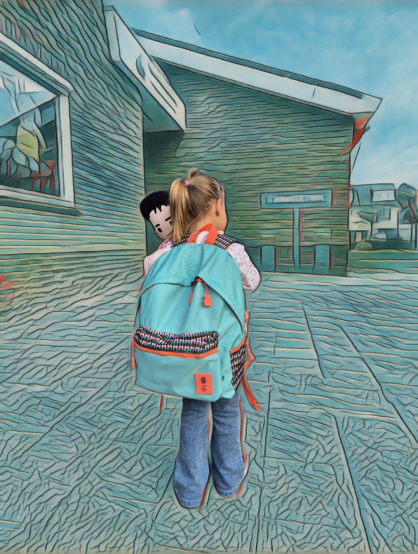 Nu ben ik het alleen, die jou aan de hand naar school brengt. Je zegt dat knuffelpapa mee moet, omdat hij ook de school wil zien en er dan toch even bij is. Met een veel te grote tas stap je met zelfvertrouwen de school binnen. Vol enthousiasme ontdek je het lokaal, het speelgoed en je eigen stoel met je naam erop. Als ik wegga krijgen zowel ik, als knuffelpapa, een hele dikke knuffel. Glunderend zwaai je nog even en gaat dan fijn spelen. Veel plezier en tot straks, mijn kleine grote meid.