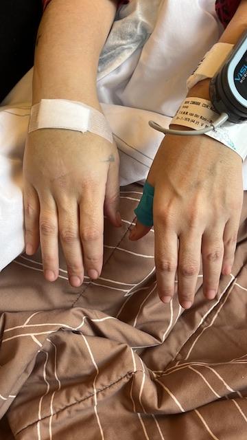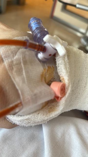Dat ging als een tering zeg zo snel joh. Echter voelde ik op de plek waar de infuus zat dat niet lekker zat. Ook het ging lekken merkte ik. De verpleegkundige vertrouwde het ook niet echt en besloten we toch eerder de infuus uit te halen om dan op pilvorm te gaan (een dagje eerder dan de bedoeling was). Dus infuus eruit en meteen zagen we hoe dik mijn arm was en ook hand. Dit kon een bijwerking zijn van de ijzer. Nu nog steeds dik maar gelukkig geen pijn.