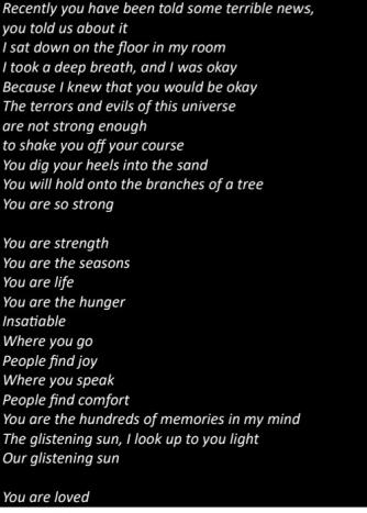 Vorige week kreeg ik een ontzettend mooi gedicht van mijn neefje. En gedichten schrijven dat kan hij. Allemaal in het engels en allemaal even bijzonder. En nu schreef hij er speciaal eentje voor mij. Een heel persoonlijk gedicht met herinnering aan mij toen hij klein was. Hij schreef erbij: Dit gedicht is voor jou en vanaf nu ván jou. Je mag het delen maar je mag het ook helemaal voor jezelf houden. Deels hou ik het ook helemaal voor mezelf. Gewoon omdat het dan ook echt van mij en van hem blijft. Maar twee coupletten wil ik hier graag met jullie delen, voor mijn lotgenoten, en daarmee hoop ik dat het jullie net zoveel kracht geeft als mij. Zie bijlage.