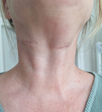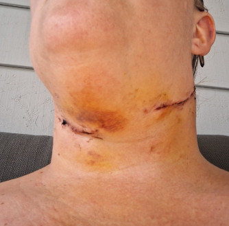Ondertussen ging het herstel thuis best goed. Het eten nam best veel tijd in beslag omdat het vrij langzaam ging. Praten ging best goed. Wel erg wennen dat je een stukje mist. Hij boog wat af naar links en dat probeer je steeds de corrigeren wat natuurlijk niet lukt. Pijn heb ik minimaal gehad. Mijn hals was behoorlijk gezwollen, omvang kalkoen. Maar dit werd in de loop van tijd minder dik en qua kleur trok het weer bij. Doordat ik mogelijk wel wat zenuwen onder de huid zijn geraakt heb ik geen gevoel onder mijn kin.