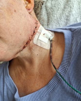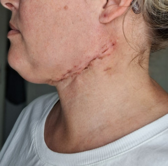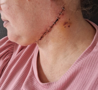 Ik word de OK ingereden die zie het hele team al klaar staan. Het is er koud maar ik krijg weer een warme deken. We nemen de operatie weer door en ik mag vervolgens lekker gaan slapen. De operatie gaat voorspoedig en zijn ze weer zo'n 5 uur bezig. Eenmaal op de uitslaapkamer ben ik weer emotioneel. Zal wel door de opgekropte emoties komen en laat het maar even gaan onder het genot van een ijsje. Eenmaal terug op de afdeling komen mij man en ouders al snel langs. Ik probeer weer wat te eten en drinken. Ijswater en brood. Ik merk wel dat m'n tong meer pijn doet dan de vorige keer. Het voelt strak en onaangenaam. De arts komt langs en verteld dat het goed is gegaan. Fijn! Er zit een drain in mijn hals en als die minder dan 10cc in 24uur mag ik naar huis. Ik ben wel geschrokken van de hechtingen in m'n hals. Dit keer zijn het krammen geworden. Dat ziet er toch best heftig uit. Ondanks dat het geen pijn doet omdat er geen gevoel ik zit. Mijn rechtermondhoek doet met praten en eten niet mee. En dat ziet er best raar uit en het maakt mij onzeker. Ik wist dat er een kans was dat dit zo zou zijn maar toch... De spier is hoogstwaarschijnlijk gekneusd en kan nog bijtrekken. Uiteindelijk mocht ik de maandag weer naar huis.