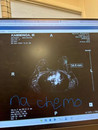 21 maart kreeg ik de uitslag van m’n eerste mri scan. Dit zag er goed uit, de chemo deed goed zijn werk de tumor was helemaal verkruimeld in het gebied van de 3,1 cm waar die zat. Dit is een goed beeld ik kon gelukkig een borst besparende operatie krijgen waar ze het gehele tumor gebied weg halen en mijn poortwachter klier uit voorzorg er ook uit zouden halen. De bloedarmoede was door 2 zakjes bloed een stuk beter geworden en ik kreeg een akkoord van de dubbele kuur. Ondertussen nog steeds last van neuropathie en veel vocht in mijn lichaam.