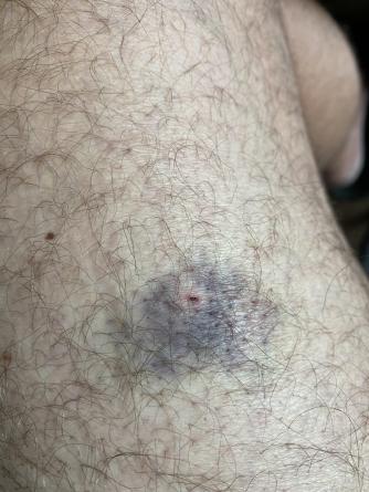 opnonderstaande foto een foto van de plaats van impact op mijn bovenbeen. Gat van de naald duidelijk zichtbaar op de paars/blauwe plek die ik aan de injectie heb overgehouden! Prutsers!!