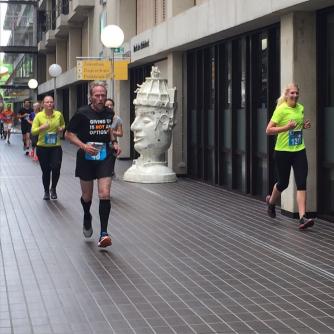 Na zo'n 2,5 km draaiden wij het AMC binnen onder luid gejuich van het dienstdoende personeel en aanwezige patiënten die mobiel waren en die even waren komen kijken om alle lopers aan te moedigen, na een rondje door het AMC gingen wij door de