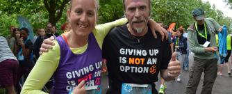 Voor de start werd ik opgemerkt door een fotograaf van Sport Connection vanwege het speciaal voor deze dag gemaakte T-shirt dat ik aan had met de tekst "Giving Up is not an Option"...ik moest op de foto voor hem en Elles kwam erbij staan want die had dezelfde tekst op haar T-shirt staan..."dank je wel" zei hij geweldige tekst...ik liep naar hem toe en vertelde hem dat er een verhaal achter de tekst zat...NIET Operabel...daarna toch een Whipple operatie en dan nu meedoen met de AMC loop...vanaf dat moment werden wij steeds door hem gespot en stond hij ons breed lachend met twee duimen omhoog ons aan te moedigen.