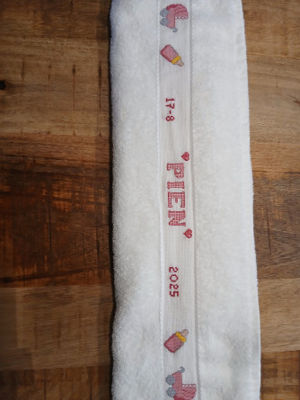 Ik maak altijd bij geboorte een geborduurde handdoek. Voor haar heb ik dat ook gedaan. Met 2 kleine hartjes naast de naam.