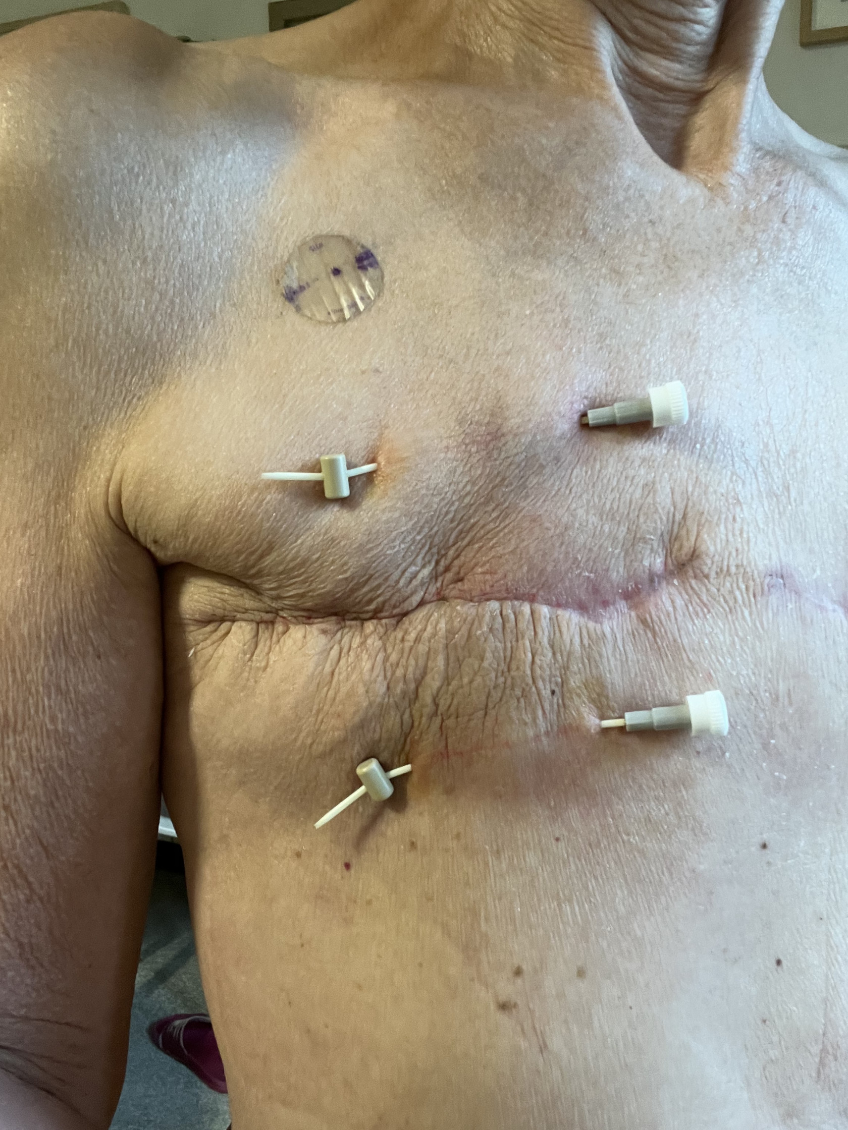 Nu ziet het er minder aardig uit.; Ik ging in juni 2023 naar het streekziekenhuis en bezocht de mammapoli omdat ik veranderingen in vorm aan mijn re borst opmerkte met verzwaring en een deels omhooggetrokken tiet. Na mammografie en echo en meerdere röntgenfotovergelijkingen constateerde de arts dat ik een gezond ogende vrouw was en dat de vormverandering en verzwaring van mijn re - borst te maken had met verlate bestralingsschade en ouderdom. Geen reden tot ongerustheid. Dat wilde ik toen ook erg graag horen. Wél kreeg echter in de zomer van 2024 andere klacht; steken in mijn borst en dit werd door de tijd heen erger. De tiet trok meer omhoog en het verschil met andere borst werd groter . OOk leek het meer opgezet te geraken en verdraaide de tepel en kwam er meer inliggen. Het litteken vormde meer kratertje en zo lelijk was ie nooit geweest. Het preventieonderzoek voor borskanker viel binnen en ik besloot dat als eerste aan te gaan.Toen stond al vrij snel mijn huisarts op de stoep en vroeg ik hem, naar zijn oor toe buigend of het met mijn tiet te maken had, dat ie er was, en dat was het geval. Sodemieter , weer in hetzelfde gebied als 20 jaar terug!