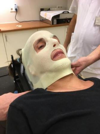 F geeft af en toe aan hoelang het uitharden nog duurt en blijft voortdurend contact houden. Ik lig er ontspannen bij. Het masker wordt van ooggaten en een mondgat voorzien en afgepeld. Mijn gezicht vertoont een fraaie weergave van het gaatjespatroon. Ik bedank iedereen voor de prettige manier waarop ze de klus geklaard hebben en ga naar de volgende halte, de CT-scan. De laboranten tuigen de tafel op exact dezelfde manier op met alle voor mij geselecteerde steuntjes en kussentjes. Met behulp van de CT worden er markeringen op het masker getekend voor het snipershot. Daarna kunnen we naar huis.