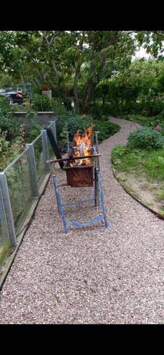 Ziet er mooi en professioneel uit, Ab. Foto's kleiner maken doe ik met een app die Lit Photo heet. Nou had ik gezegd: show yours and I show mine. Nou heb ik geen uitgebreide ruimte, maar wel een houtgestookte bbq gemaakt van een stalen kastdeur. En dus twee meter lang. En ik stook er pallets in om een goede aslaag te krijgen en daarna gaan er wat droge stammetjes in voor een gloeiende bak vuur.