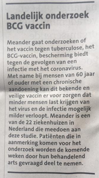 Nu lees ik vandaag echter dat er onder ruim 6000 mensen van 60 jaar en ouder onderzoek is gedaan naar de werkzaamheid van BCG tegen Covid-19, uitgevoerd in ruim 20 ziekenhuizen, waarbij de proefpersonen werden gevaccineerd met BCG. Helaas is gebleken uit het onderzoek dat de BCG kwetsbare ouderen geen bescherming biedt tegen Covid-19. Daarnaast lopen er in Nederland meerdere onderzoeken naar het effect van BCG op Covid-19, maar dan bij andere onderzoeksgroepen. Normaliter zou ik wel positief hebben gereageerd dat alle opties worden bekeken in de strijd tegen Covid-19, maar nu denk ik: er was al zo weinig BCG vaccin en straks is het helemaal op. Voor de soort blaaskanker die ik heb is een BCG-spoeling helaas de enige behandelmethode. Ik kan alleen maar hopen dat omdat er nog onderzoek wordt gedaan met BCG bij andere onderzoeksgroepen, er mogelijk misschien wel meerdere farmaceuten het BCG-vaccin gaan produceren om tekorten tegen te gaan. Ik ga er maar het beste van hopen!