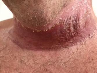 De huid is helemaal rood en er zitten blauwe plekken in en hele plakkaten schilfertjes. Kortom, het ziet er niet zo fraai uit