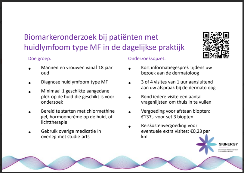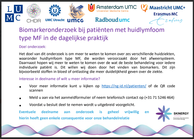 Tijdens de Huidlymfoomdag gaf drs Elise Beljaards een korte presentatie over een wetenschappelijk onderzoek. Samen met alle andere academische ziekenhuizen worden patiënten gezocht met MF in een laag stadium en ziektes die daar op het eerste gezicht op lijken zoals psoriasis, eczeem en dergelijke. Van elke aandoening zoeken ze 120 deelnemers, en 120 gezonde mensen ter vergelijking. Gezien het betrekkelijk kleine aantal mensen met MF is het extra belangrijk dat je even kijkt of je hier wellicht aan kunt en wilt deelnemen.